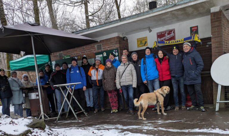 Letzten Samstag trafen sich 25 ehemalige (aber auch noch ein paar aktive) Handballerinnen und Handballer um die alte liebgewonnene Tradition der Ehemaligen-Treffen wieder aufleben zu lassen. Eine leichte Wanderung führte uns über den Dichterblick (Danke Hanse für die vorgeheizte Hütte!) zum Kernenturm. Leider fand die dort geplante Stärkung nur in flüssiger Form statt. Der Abstieg war dann über den Katzenkopf und das Schützenhaus auf Grund der Witterungsverhältnisse ( und der ausgefallenen Stärkung) schon etwas schwieriger! Aber alle Teilnehmer erreichten trotzdem wohlbehalten die Besenwirtschaft Beck, wo dann auch die wohlverdiente feste ( und nicht nur die…) Nahrung auf die tapferen Wanderer wartete. In trauter Runde fand dann ein schöner Tag seinen Abschluss und die Teilnehmer waren einvernehmlich der Meinung, dass eine baldige Wiederholung des Treffens dringlichst angestrebt werden sollte! Diese Diskussion fand dann endlich zur späten Stunde auch bei den letzten Heimkehrern in einer ortsbekannten Stettener „Späti“ zu ihrem würdigen Ende.
